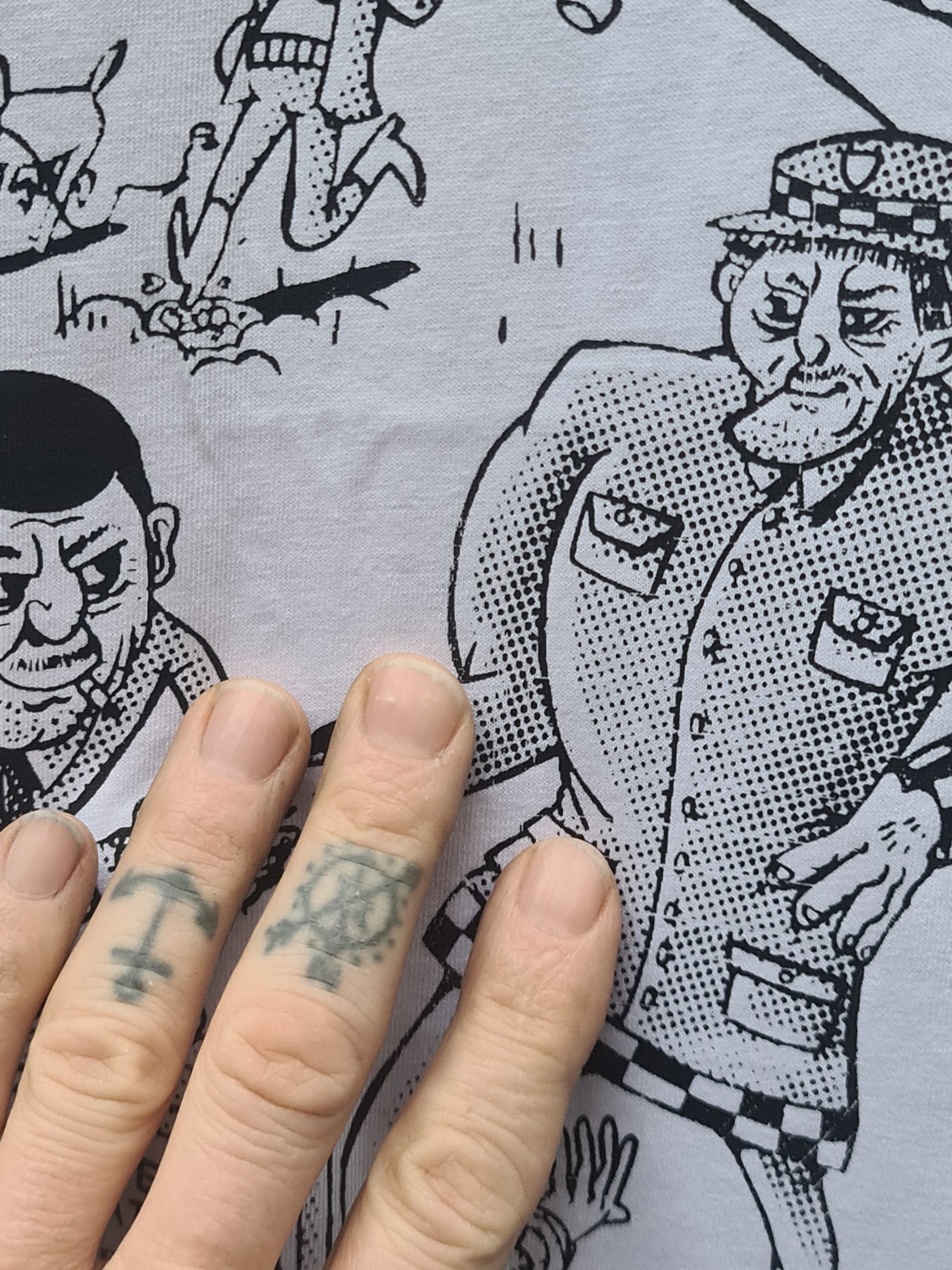 The shirts are screen printed by hand on our own Quality T-shirt made of 100% Organic Cotton. Printed with waterbased environmental friendly color. Classic SHIT fit.